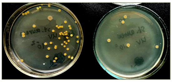 where Lg Red—logarithmic reduction factor; C0—cells concentration before the experiment; and C—concentration of bacterial cells after the experiment. In our case, C was considered in two versions: (1) CTiO2+UV—concentration of bacterial cells on the surface of “PET TM + TiO2” systems after UV-irradiation and (2) CUV—control the concentration of cells after UV-irradiation without “PET TM + TiO2” systems. The results are summarized in Table 3. Also, visual images of cells with the developed system are shown in Figure 8.