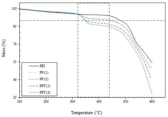 Furthermore, it was observed that the addition of PVAc to the PEI matrix resulted in a decrease in thermal properties as the proportion of the rubbery phase increased. In reference to the degradation temperature, neat PEI displayed a degradation temperature of 482 °C, which decreased to 340 °C for PP(2). These findings imply that adding rubbery PVAc to the glassy PEI matrix reduces its thermal properties. However, this trend was reversed with the addition of TiO2 into the blend membranes. The incorporation of 2 wt.% of TiO2 into the PEI–PVAc blend led to a recovery in the degradation temperature, which reached 450 °C. This indicates that an improvement in thermal stability was achieved by adding titanium to the blend membrane. Similar observations have been reported, such as the development of a polyethersulfone (PES) and PVAc blend membrane, which exhibited lower thermal stability compared to a plain PES membrane [20]. However, the addition of TiO2 reversed the thermal stability and restored it. These observations have also been reported in other studies [21].