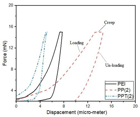 Figure 5 illustrates the compliance curve of neat PEI, PP(2), and PPT(2) membranes. A total of nine indents were applied to each sample, with a spacing of 40 μm between them. The membrane samples were subjected to a constant load of 15 mN, resulting in a maximum penetration depth of 15 μm. The unloading phase following the application of constant force exhibited a creep region, as depicted in Figure 5. Creep refers to a change in depth over time while maintaining a constant force, and it reached a new limit just before unloading. Subsequently, the indenter began to unload. The absence of overlap between the loading and unloading curves shown in Figure 5 suggests that the developed membranes demonstrated both elastic behavior and distinct plastic characteristics [23]. The loading and unloading curves appeared continuous and stable for all developed membranes.