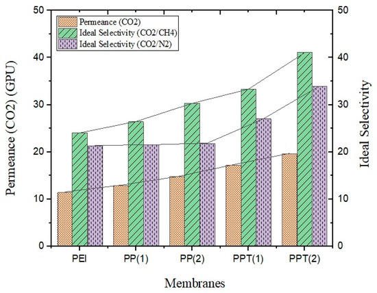 CO2 permeance and ideal selectivity (CO2/CH4, CO2/N2) of developed membranes.