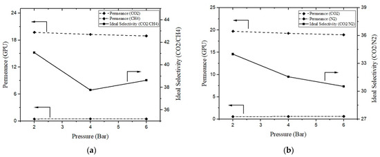 Nonetheless, as the membrane swelling decreases, the competitive transport between CH4, N2, and CO2 molecules is anticipated to become more pronounced. This phenomenon leads to a significant decline in gas selectivity. As depicted in Figure 7a, the ideal selectivity for CO2/CH4 gas decreased as the temperature increased. The value decreased from 41.1 to 38.6 as the temperature increased from 2 to 6 bar pressure. The effect of pressure change was more significant for CO2/N2 gas, as the selectivity decreased from 34 to 30.53. These results are consistent with those reported in the literature [27]. In another study, Matsuyama et al. developed polyethylenimine (PEI)-poly(vinyl alcohol) (PVA) blend membranes, and observed that with an increase in feed pressure, CO2 permeance decreased and N2 permeance remained almost the same, thereby decreasing CO2/N2 selectivity [28].