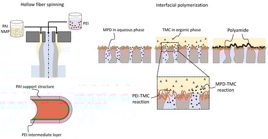 Schematic of the polyamide-imide (PAI) hollow fabrication with an incorporated polyethylenimine (PEI) intermediate layer and the subsequent interfacial polymerization (IP) of m-phenylenediamine (MPD) and trimesoyl chloride (TMC) performed in this work. On the left, a schematic representation of the dry–wet jet hollow fiber spinning, where the polymer solution containing PAI and the bore solution containing PEI are used. During the spinning process, PEI adsorbs to the inner surface of the hollow fiber, forming a composite membrane. On the right side, the figure depicts the subsequent modification using the IP of MPD and TMC. Both MPD and PEI react with TMC, enabling the covalent attachment of the newly formed polyamide layer to the support of the hollow fiber. This process results in the formation of defect-free thin-film composite hollow fiber membranes.