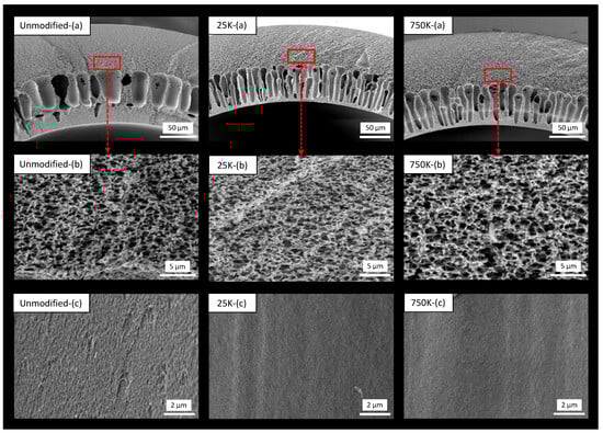 SEM images of unmodified, 25k, and 750k fibers; (a) cross-section, (b) morphology of the middle part, (c) lumen surface.