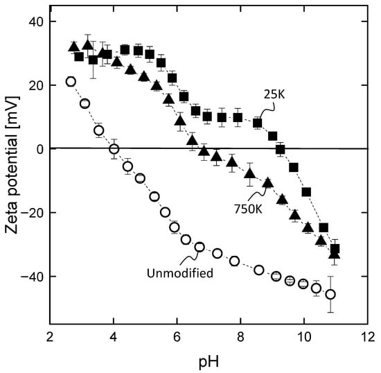 Zeta potential of the inner surface of hollow fiber membranes without (unmodified) and with (25K, 750K) intermediate PEI layers on the lumen of the fibers as a function of pH, n = 3.