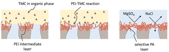 Schematic representation of the cross-linking of the intermediate layer upon contact with an organic solution containing TMC. The reaction of PEI and TMC leads to the formation of a dense selective layer with nanofiltration properties.