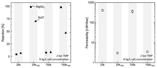 Performance of 25k and 750k hollow fibers before and after treatment with TMC, n = 2. On the left: salt rejection of MgSO (□) and NaCl (△). On the right: permeability measured during MgSO salt rejection experiments.