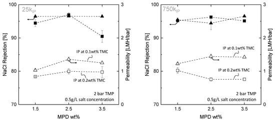 NaCl rejection and permeability of membrane modules prepared with 25k supports (left) and 750k supports (right) coated with different MPD concentrations (1.5, 2.5 and wt%) and wt% TMC (triangular makers), and wt% TMC (square marker), n = 2.