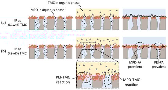 We propose a reaction mechanism between TMC and MDP in the presence of a PEI surface layer, which is illustrated in Figure 8. Here two scenarios are portrayed. The first scenario represents a low concentration of TMC (a). The low TMC concentration does not lead to the rapid formation of a cross-linked PEI layer. Therefore, the diffusion of MPD into the organic TMC phase is not as severely hindered, and a smooth but selective layer is formed. At this stage, the selective layer consists mainly of PA formed through the reaction of MPD and TMC, as reflected by the high rejections. A second scenario portrays a higher concentration of TMC (b). Due to the higher concentration of TMC, the reaction of PEI and TMC is more dominant than in the wt% TMC case, reducing the diffusion of MPD into the organic TMC phase. As a result, a selective layer of PEI-TMC PA is formed at the surface of the hollow fiber, while a reaction of MPD and TMC would take place deeper inside the pores. Indeed, inside-pore PA formation has been reported to significantly reduce water permeance [59].