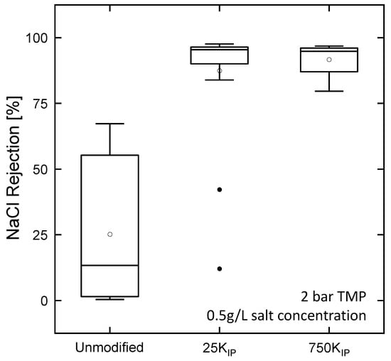 NaCl rejection of hollow fibers after IP coating of supports without a PEI intermediate layer (unmodified) and with a PEI intermediate layer (25k and 750k). A total of n = 6 modules for the unmodified support were coated, and n = 21 modules of each 25k and 750k. White markers represent the average rejection and black dots represent outlier samples.