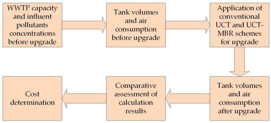 In this research, the calculated justification of modernization was considered using the example of a virtual WWTP with typical characteristics. However, the sequence of necessary calculations, which usually precede the modernization of real WWTPs, corresponded to generally accepted practice. The scheme of the research is shown in Figure 1.
