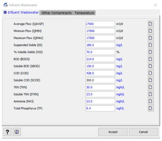 Based on these values, the oxidation rate, hydraulic retention time (HRT), and volume of the tanks can be calculated. The results of the calculation of the structures are presented in Table 5, while these calculations can be performed both manually by the method [29] and in the CapdetWorks environment [30]. The software constructs each unit process in a specified process layout based on the influent characteristics and then estimates the design cost. The two-step procedure allowed for the inspection of the generated design and, if necessary, modification with the program’s design override features. Typical design defaults have been used for each unit process to offer usable computed designs and make the program easier to use for planners who need planning-level cost estimates for a new facility or an upgrade to an existing facility. The input parameter interface is shown in Figure 3.