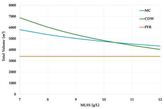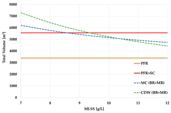 A comparison (Figure 9) reveals that when the MLSS are 10–12 g/L, the required volume of the ASR + MR for UCT-MBR technology is now less than the ASR + SC volume for the PFR technology. If we consider these values from the point of view of modernization, it means that if UCT-MBR technology is applied, the WWTP upgrade would not require constructing new tanks. Nevertheless, existing tanks will certainly need repairing and/or re-equipment due to wear.