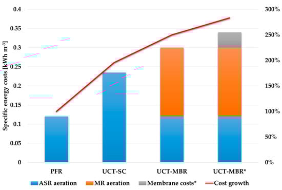 Figure 10 shows calculated values of the specific energy consumption for the considered technological schemes. The UCT-MBR* bar shows the overall specific energy consumption if membrane costs are presented as specific energy consumption. It can be seen that the transition to an advanced scheme of treatment leads to a significant growth in energy consumption [16,33]. The application of an MBR means less tank volume for the ASR, which reduces the energy consumption for aeration in the ASR; however, membrane aeration is an extremely energy-consuming process. If we consider membrane costs throughout their life cycle (10 years), they account for about 13% of the total cost of electricity for aeration within this period.