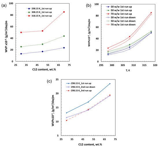Dense nanocomposite PEBAX membranes filled with [C12C1im]Cl were prepared via dry phase inversion with the intent to investigate how ILCs can affect water vapor transport through them. Changes in permeation, namely breathability, were investigated according to the right cup method procedure [8,54], and membranes filled with three different amounts of filler (30, 50, 70 w/w) were tested by running the temperature from 298.15 to 318.15 K and then down to 298.15 K again (Figure 2). Interestingly, the increase in the [C12C1im]Cl content produces amplified water transport, which is further raised with temperature. This effect appears to be more marked at the highest concentration of filler, indicating a wider assistance to water vapor permeation (Figure 2a). Moreover, the reversibility of the process can be detected as the temperature decreases from 318.15 to 298.15 K (Figure 2b), suggesting the IL as a powerful choice for making the membranes responsive to changes in temperature.
