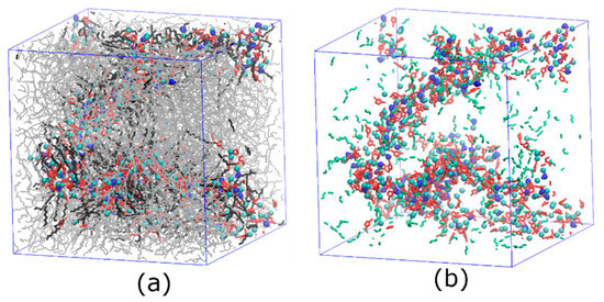 The snapshots of membranes with PEBAX and 30% w/w [C12C1im]Cl. The mole ratio of water to [C12C1im]Cl is 1:3. (a) All components. (b) Polar groups (head of cation, Cl−, water, and amide) only. The gray lines are PEBAX chains, the black lines are [C12C1im] side chains, the red rings are cationic head groups, the cyan balls are chloride ions, the blue beans are water molecules, and the green sticks are amide bonds in PEBAX.