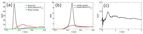 RDFs of (a) water with Cl−, head of [C12C1im], and amides; (b) amides with amides and head of [C12C1im]; (c) orientational correlation function of [C12C1im] side chains, respectively, for the membrane with PEBAX and 30% w/w [C12C1im]Cl at 298 K.