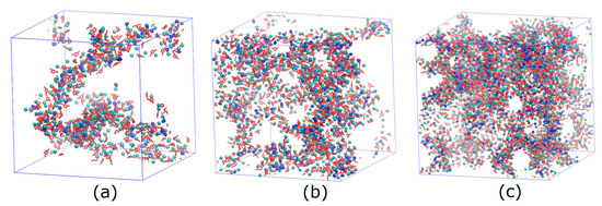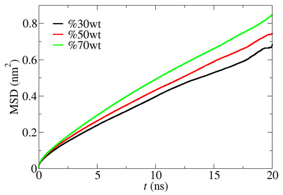 The tendency of the diffusivity of components in the system changing with the concentration of water molecules (Figure 7f) is basically consistent with the research results of Jiang et al.’s work [70] on water molecules in pure ILs, which reveals that the diffusion of water and ions is very slow but increases significantly when the water content is greater than 50% mole fraction.