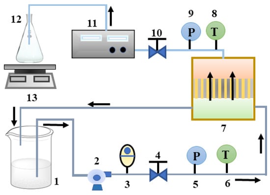 Experimental flow chart. (1. raw material drum; 2. pressure pump; 3. control valve; 4, 10. pressure valve; 5, 9. pressure gauge 6, 8. thermometer 7. membrane block 11. conductivity meter 12. permeate collection bottle 13. electronic scale).
