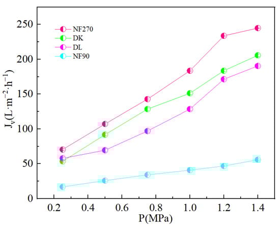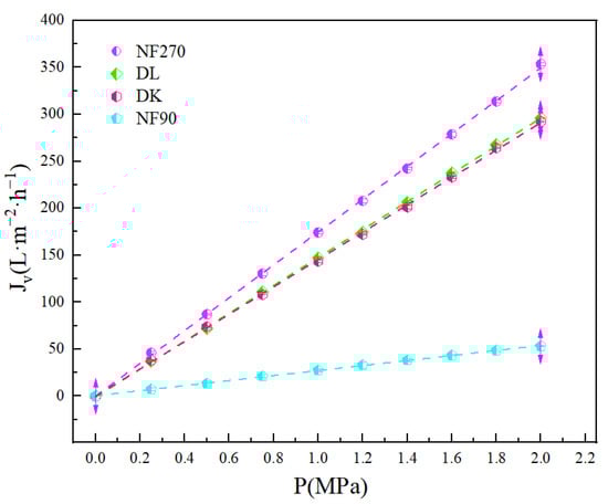 The relationship between pure water permeation flux and operating pressure of various nanofiltration membranes was obtained. Some test sites deviated due to the instability of the nanofiltration membrane and the nanofiltration equipment under high pressure conditions while the membrane maintained good stability in the low-pressure range, but the error was within the acceptable range (<5%), which had little impact on the experimental results, as shown in Figure 2. The corresponding permeability coefficient of the membrane () was estimated by fitting the data and the performance was in the increasing order of NF270 (: 174.76) > DK (148.56) > DL (145.63) > NF90 (26.73). refers to the influence of pressure on membrane flux; the larger the is, the more significant effect of pressure on membrane flux is.