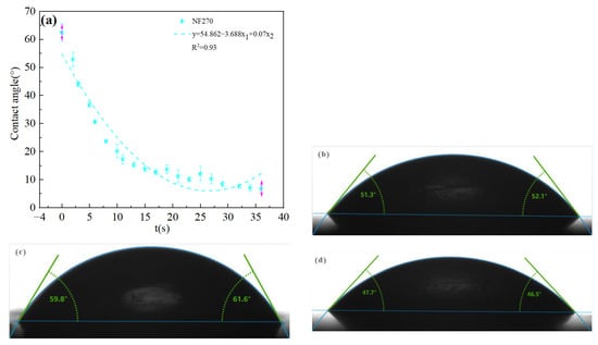 (a) Dynamic contact angle of DL film and contact angle diagram of (b) DK, (c) NF270, (d) NF90.