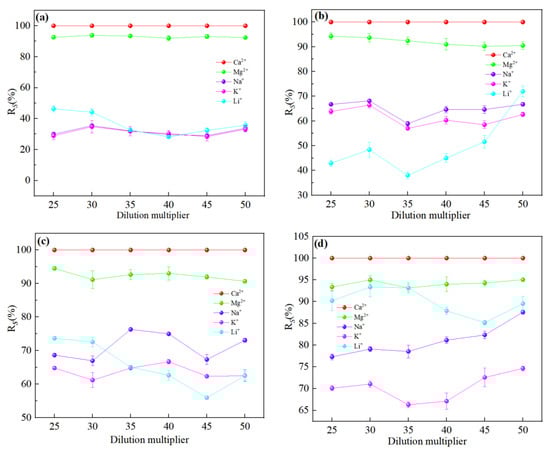 Retention efficiency (%) of each ion at different dilution multiplier: (a) DL; (b) DK; (c) NF270; (d) NF90. The experimental conditions of the four types of nanofiltration membranes were: operating pressure = 0.5 MPa, circulation flow rate = 600 L/h, and feed pH = 7.