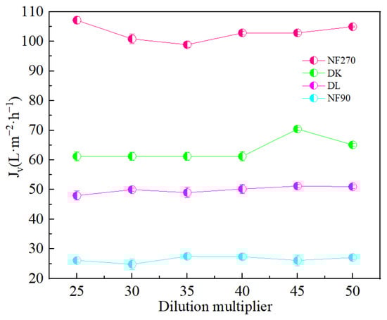Effect of different dilution multipliers on the membrane flux (Jv).