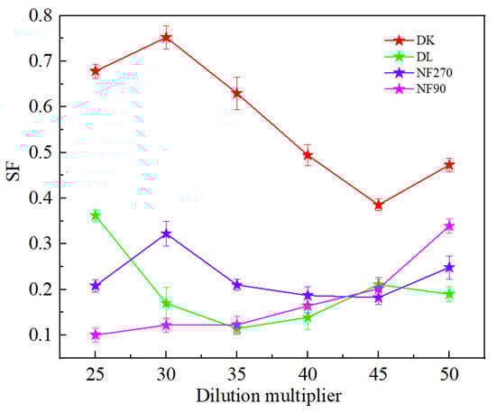 Figure 5 showed that the dilution factor had little effect on the permeate flux of the membrane. Although the NF90 membrane had the smallest contact angle and the strongest hydrophilicity, due to the smaller membrane pore size, the solute flux was lower than the water flux, and resulted in the largest. However, the separation factor showed a significant reduction in the increase in the dilution factor, which was conducive to separation. The separation factors of all membranes were different, but less than 1, indicated its effectiveness on the separation of Mg2+-Li+ according to Figure 6.