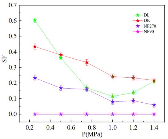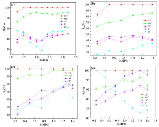 Figure 8 showed the relationship between the percentage of ion rejection and operating pressure. The ions in the dialysate were concentrated, which is because the water flux and membrane flux of each ion were not very different under the low pressure, which resulted in a low interception rate of each ion. The driving force of water molecules and the ions through the membrane increased with the increasing pressure, but because the increase in water flux was significantly higher than the flux of each ion, the concentration of each ion in the dialysate was diluted and the interception rate increased [35]. The dilution effect was unfavorable for ion separation, so the separation process was not good to use large pressure. The Li+ interception rate decreased with the increase in pressure as shown in Figure 8d. Li+ was unable to obtain enough power to pass through the membrane hole under the low pressure, which led to a high interception rate. With the increasing pressure, Li+ obtained sufficient energy to remove the hydration layer and through the membrane, which led to a decrease in the interception rate. Figure 9 showed the SF decreased with an increase in the operating pressure, but the larger pressure could cause significant dilution effect, which was not conducive to ion interception. Therefore, the best operating pressure should be selected according to the interception performance of different nanofiltration membranes.