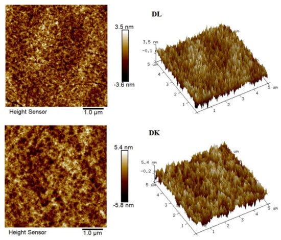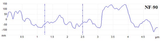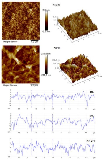 The flow state of the feed liquid on the surface of the membrane was related to the roughness of the membrane surface [36]. Figure 10 showed the AFM images of the membranes, evidenced the variation in the surface roughness. The surface roughness was found to decrease in the order: NF90 (Ra = 42.2 nm) > DK (Ra = 1.31 nm) > DL (Ra = 1.0 nm) > NF270 (Ra = 0.52 nm). The membrane surface had a typical ‘ridge-valley’ structure, and the peak density was found in descending order of NF270 > DL > DK > NF90. The ‘nanoscale’ structure on the surface could accelerate the microscopic mixing of the feed liquid. The hydrodynamic condition was improved by the enhance of the interface contact area, and the permeate flux was increased as a result, as shown in Figure 11.