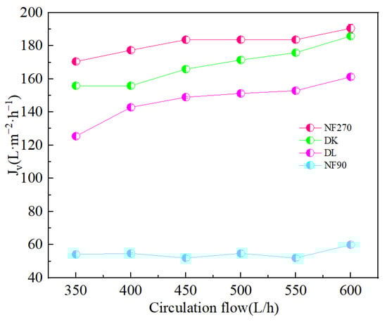 where: µ is the dynamic viscosity of the raw material solution (Pa · s); Rt is the total separation resistance (m−1); is the membrane surface resistance; is the concentration polarization resistance; is the adsorption resistance; and is the fouling resistance. With the increase in pressure, the kinetic force of ions across the membrane increases, which weakens the Donnan repulsion effect. At the same time, due to the cross-flow filtration method, the residence time of ions on the membrane surface is shortened, which weakens the concentration polarization effect. The reduction in the enrichment of ions on the membrane surface reduces the fouling resistance and the resistance of ions adsorbed on the membrane surface, all of which contribute to the reduction in separation resistance and increase in permeate flux. Figure 7 showed an increase in the permeate flux with an increase in operating pressure and an increase in the order: NF270 > DK > DL > NF90.
