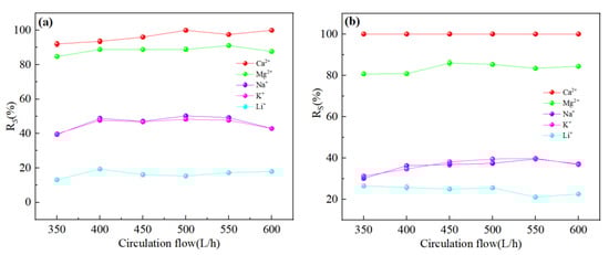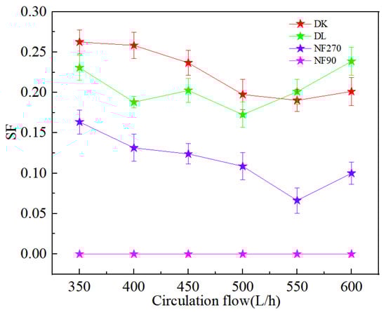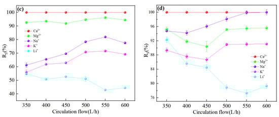 Figure 12a,b showed the ion rejection efficiency of DL and DK membranes were stable with an increase in circulation rate. This could be attributed to the decrease in the aggregation of ions on the membrane surface, contributed to a decrease in membrane fouling and concentration polarization effects. The reduction of membrane fouling would be contributed to an increase in ion flux, while weakening of the concentration polarization effect would reduce the driving force of ions, as a result of contradicted effects the rejection efficiency remains stable. It could be seen from Figure 12c,d that the Li+ rejection efficiency was opposite to that of Na+ and K+, which could be attributed to the reduction in the residence time of ions on the membrane surface, contributed to a reduction in the ion concentration, thereby reduced the competitive permeability of Na+ and K+. The rejection efficiency decreased as Li+ was more easily permeable through the membrane. The decrease in SF indicated better Mg2+-Li+ separation, as shown in Figure 13.
