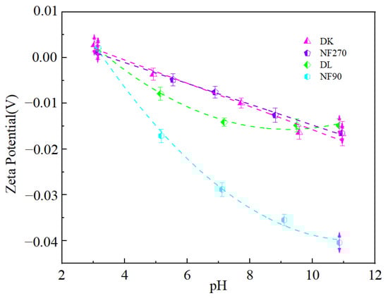 The isoelectric point of the membrane (Zeta potential = 0) was shown in Figure 14. The decreasing zeta potential was of the order: DK (3.8) > NF270 (3.53) > DL (3.48) > NF90 (3.31). When the pH was lower than the isoelectric point, the surface of the membrane was positively charged, while it was negatively charged at a pH higher than the isoelectric point [38]. The characteristics of membrane surface charge were related to the dissociation of membrane surface groups and the adsorption of anions and cations (H+, OH−) in solution [39]. Since the nanofiltration membrane had a polyamide functional layer, the residual carboxyl functional group on the surface of the membrane dissociated when in contact with an aqueous solution and became negatively charged. However, the CH+ in the feed solution was relatively high at pH 3, and the accumulation of H+ would cause charge reversal. The zeta potential of the membrane surface decreased with the increase in pH. This was because the composition of salt-lake brine was complex, and there were a large number of anions (Cl−, SO42−) in addition to metal cations. The dehydration ability of anions was stronger than that of cations, so they were more likely to lose binding. When the water reached the surface of the membrane, a large number of anions were adsorbed on the surface of the membrane, thereby increased the negative charge on the surface of the membrane.