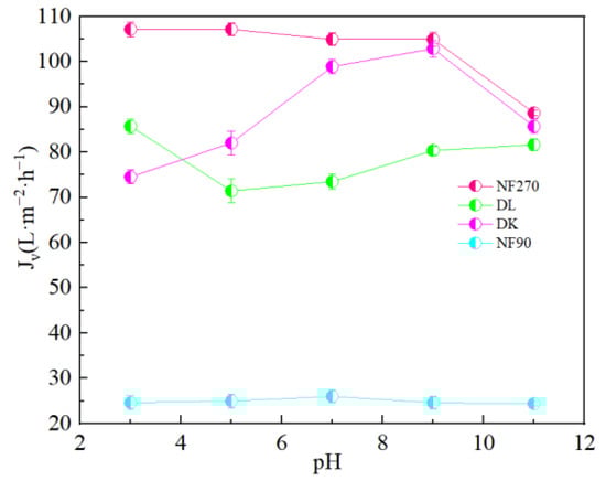 The pH of the feed solution will affect the membrane surface charge, thereby affecting the Donnan repulsion and the dielectric repulsion effect [37]. The pH of the feed solution was altered using NaOH and HCl (1 mol/L) and varied in the range from 3 to 11. Each experimental data point had been validated by at least three sets of parallel experiments.