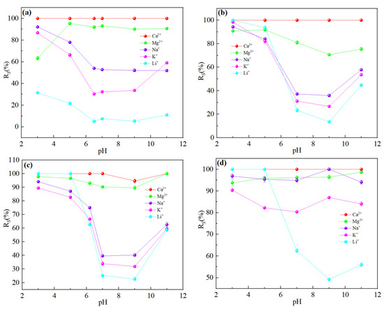 Retention efficiency (%) of each ion at different pH: (a) DL; (b) DK; (c) NF270; (d) NF90. The experimental conditions: DL (dilution multiplier = 40, operating pressure = 1.2 MPa, and circulation flow rate = 500 L/h); DK (dilution multiplier = 35, operating pressure = 1.0 MPa, and circulation flow rate = 550 L/h); NF270 (dilution multiplier = 40, operating pressure = 0.75 MPa, and circulation flow rate = 550 L/h); NF90 (dilution multiplier = 45, operating pressure = 1.4 MPa, and circulation flow rate = 600 L/h).