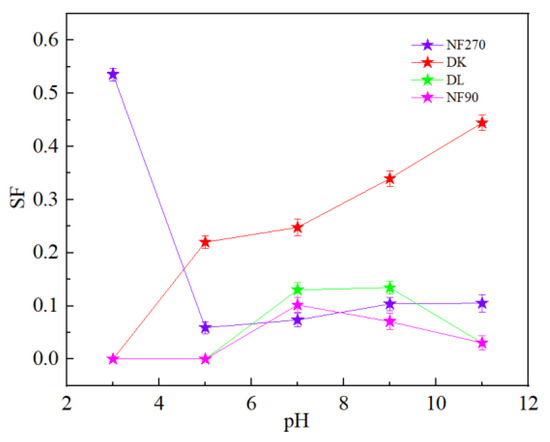 It could be seen from Figure 15 that pH had little effect on the flux of NF270 and NF90 membranes, while DL and DK membranes showed different trends. As shown in Figure 16, divalent cations were less affected by the pH, and monovalent cations showed a ‘concave’ shape change trend with the pH. When the pH was lower than the isoelectric point, the solution contained excess H+. Since H+ has a smaller hydration radius and a larger diffusion coefficient, it was easier to permeate the membrane and limited the penetration of other monovalent cations, resulted in a higher rejection. When the pH of the feed solution was higher than the isoelectric point, as the pH increased, the CH+ in the feed solution gradually decreased while the COH- gradually increased, which led to the negative charge density on the surface of the membrane increasing and needing to attract cations to maintain electrical neutrality. Based on the Donnan effect, the stronger the negative charge on the membrane surface, the greater the attractive effect on the multivalent cations than on the monovalent cations is, which was not conducive to separation, so the pH of the feed solution could be kept at 7–9 to obtain smaller SF, as shown in Figure 17.