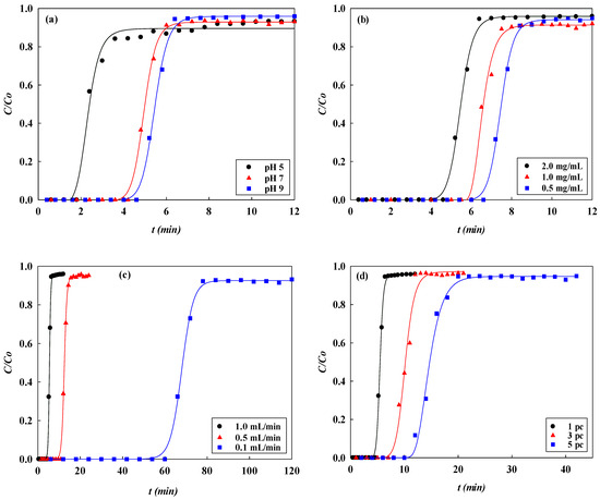 The purpose of this work was to use the designed nanofiber membrane reactor to determine the dynamic binding performance of lysozyme in a flow system. The effects of process parameters such as adsorption pH, inlet lysozyme concentration, liquid flow rate, and the number of stacked membrane layers on the breakthrough characteristics of the adsorption system were investigated. In this work, various dynamic adsorption models, such as the Bohart–Adams model, Thomas model, Yoon–Nelson model, and bed depth service time (BDST) model [22,23,24,25,26,27,28] were used to evaluate and predict the adsorption performance of the tris(hydroxymethyl)aminomethane affinity nanofiber membrane (namely, P-Tris) for lysozyme. The mathematical models used to study the breakthrough characteristics are described in Section 2.6. To analyze the breakthrough curve characteristics of the dynamic binding experiments, important performance indicators calculated from the breakthrough curves were used to assess the dynamic binding performance of the P-Tris nanofiber membrane to lysozyme (e.g., dynamic binding capacity (DBC), maximum (equilibrium) binding capacity (EBC), mass transfer zone length (HMTZ), membrane adsorbent exhaustion rate (MAER), membrane bed utilization (MBU, %), and productivity of lysozyme (P) [9].