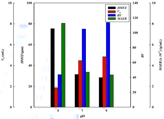 Breakthrough curve analysis for V10%, BV, MAER, and HMTZ at different pH values.
