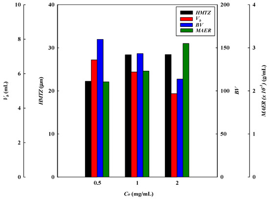The calculated MAER was found to increase from 2.21 × 10−3 g/mL to 3.10 × 10−3 g/mL when increasing the lysozyme concentration from 0.5 to 2.0 mg/mL. In the adsorption process, the driving force for the adsorption of lysozyme increases with increasing lysozyme concentration. Consequently, the binding sites have a higher saturation when subjected to a higher concentration of lysozyme, and this led to a higher adsorber exhaustion rate. In this case, the values of HMTZ increased from 22.24 μm to 28.43 μm as the lysozyme concentration increased from 0.5 to 2.0 mg/mL. This indicates that a higher concentration of lysozyme may lower the binding performance for lysozyme. The membrane adsorber utilization (MBU) decreased from 87.60% to 83.85% as the lysozyme concentration increased from 0.5 to 2.0 mg/mL. On the contrary, the productivity (P) increased from 33.33 to 133.33 (mg/min·g).