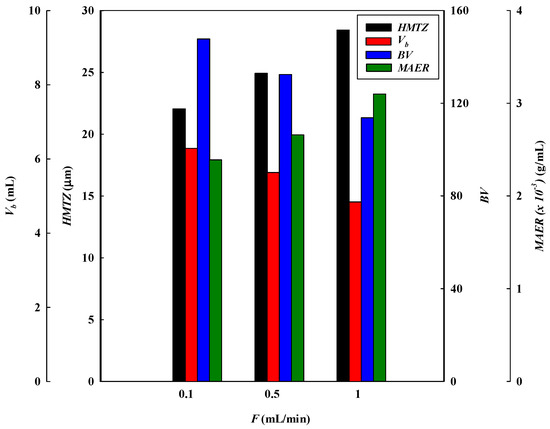 Breakthrough curve analysis for V10%, BV, MAER, and HMTZ at different loading flow rates.