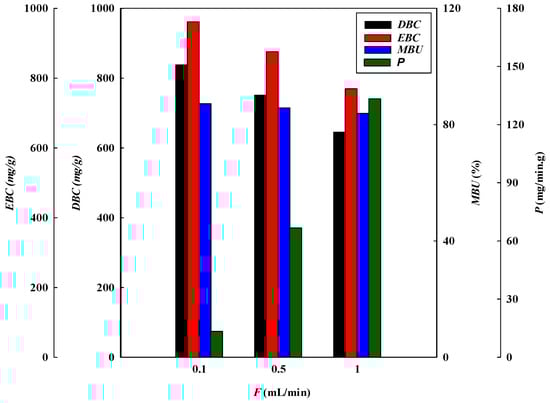 Breakthrough curve analysis for DBC, EBC, MBU, and P at different loading flow rates.