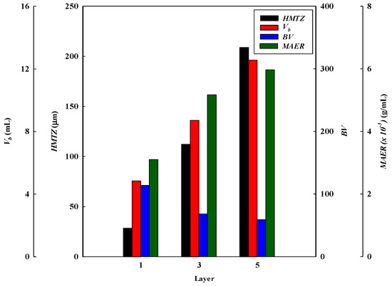Breakthrough curve analysis for V10%, BV, MAER, and HMTZ at different stacked membrane layers.