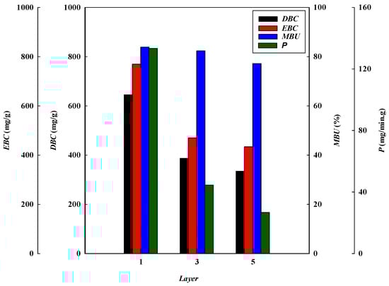 Breakthrough curve analysis for DBC, EBC, MBU, and P at different stacked membrane layers.