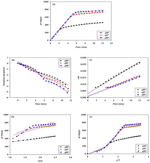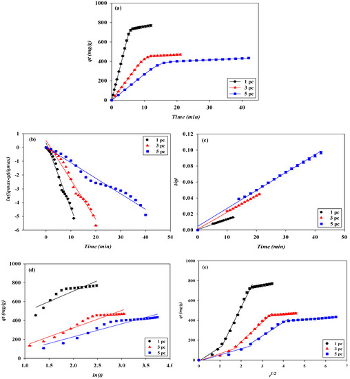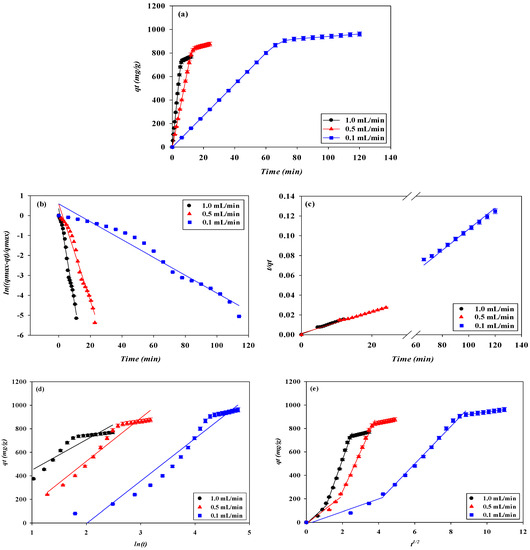 The dynamic experiment data obtained from the breakthrough were fitted into different kinetic models to investigate the controlling mechanism of adsorption and the rate constant of adsorption. The experiment data were fitted with four kinetic models. Adsorption on the nanofiber was described by pseudo-first-order (Equation (6)) and pseudo-second-order (Equation (7)), Elovich (Equation (8)), and intraparticle diffusion (Equation (9)) kinetic models [10,19]. The linearized kinetic models are as follows: