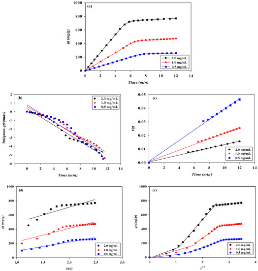 (a) Adsorption rates for lysozyme by P-Tris nanofiber membrane under different lysozyme concentrations. Kinetic adsorption of lysozyme fitted by (b) pseudo first-order model, (c) pseudo-second-order model, (d) Elovich, and (e) intraparticle diffusion model.
