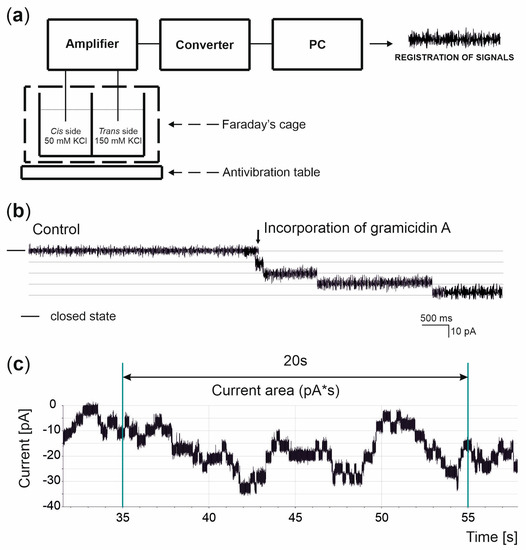 - Bean, R.C.; Shepherd, W.C.; Chan, H.; Eichner, J. Discrete conductance fluctuations in lipid bilayer protein membranes. J. Gen. Physiol. 1969, 53, 741–757. [Google Scholar] [CrossRef] [PubMed]