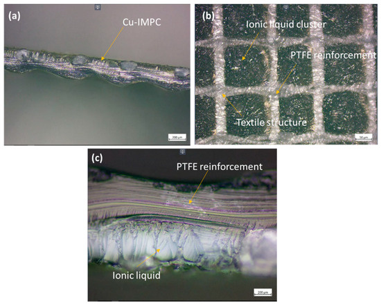 The examination of surface morphology features of PTFE-reinforced Nafion thin film before and after modifications was conducted through a microscope and scanning electron microscopy (SEM), emphasized in Figure 3. A characteristic of textile-like pattern arresting ionic liquid clusters and ionic liquid with PTFE as a backbone is clearly seen in the microstructure, Figure 3a–c. The sample consists of an electrode layer of thickness 15.6 µm with silver and copper particles that are evenly distributed with diameters ranging in the tens of nanometers as shown in Figure 2 and Figure 3d,e. Despite the uniform distribution of particles on the surface, the chemical plating process results in the formation of small micropores. It is possible that there is a lack of enough adhesion between the surface layer of the membrane and copper particles. However, the presence of pores on the membrane may confer an additional benefit to the antibacterial efficacy of water purification, as it enables the entrapment of microorganisms and the adsorption of metal ions [17]. Moreover, in the context of nanogenerator implementation, a surface that is coated with Cu and Ag exhibits uniformity and is free of irregularities, indicating a desirable level of adhesion between the Nafion film and the metal particles. Consequently, the facilitation of current flow through the IPMCs is enabled for the purpose of energy generation.