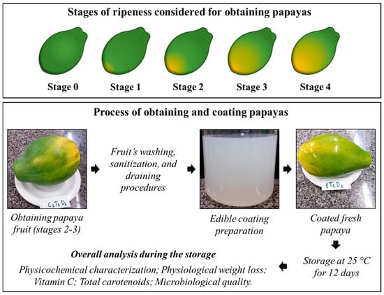 Previously washed, sanitized, and drained papayas were immersed once in approximately 700 mL (amount pre-defined as enough to cover the whole fruit) of the coating solution, for 2 min. Then, fruits were drained, placed in containers, and stored at 25 °C, for 12 days. Experimental day 1 refers to the first day of the fresh product right after treatment preparation.