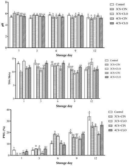 Mean and standard deviation values recorded for pH, total soluble solids (TSS), and physiological weight loss (PWL) of fresh papaya fruits, both uncoated and coated with cassava starch-based coating added with cinnamon or clove essential oil, during storage at 25 °C, for 12 days. Treatments represented by bars showing the same letter, on the same storage day, did not significantly differ from each other in the Tukey test (p > 0.05), which was conducted in triplicate.