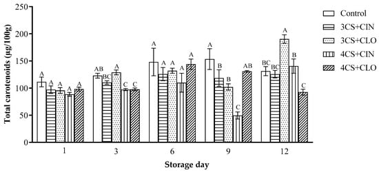 Mean and standard deviation values recorded for vitamin C (mg/100 g) and carotenoid contents (µg/100 g), during the storage of fresh papaya fruits, both uncoated and coated with cassava starch-based coating added with cinnamon or clove essential oil, at 25 °C, for 12 days. Bars with the same letter, on the same storage day, did not significantly differ from each other in the Tukey test (p > 0.05), which was conducted in triplicate.