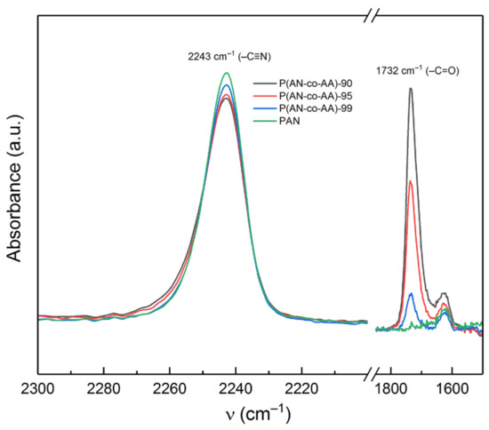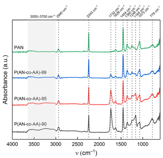 The chemical structure of the synthesized acrylonitrile homopolymer and copolymers was studied by FTIR spectroscopy (Figure 1). All the IR spectra show a characteristic band of stretching vibrations of the nitrile group (νC≡N) at 2243 cm−1, which refers to the monomer units of acrylonitrile. Another characteristic band, indicating the presence of monomer units of acrylic acid, refers to the stretching vibrations of the carboxyl group (νC=O). Its presence at 1732 cm−1 is observed only for the copolymer samples, which confirms the copolymerization of the initial AN and AA monomers. The nearby band at 1628 cm−1 can be attributed to the deformation vibrations of water [53]. The bands at 2940 cm−1 correspond to –CH2 stretching vibrations, the bands at 1360 and 1454 cm−1 correspond to –CH2 bending vibrations, and the band at 1075 cm−1 corresponds to mixed –CH2 vibrations [54,55]. The bands at 1248 and 778 cm−1 can be attributed to mixed vibrations of the C–H bond [55,56,57]. The band at 1170 cm−1, which is present only in the spectra of the copolymers, belongs to vibrations of C–O and C=O bonds in the composition of AA monomer units. The region at 3000–3700 cm−1 refers to –OH bonds and adsorbed water [55,58]. The intensity of this band is higher in the copolymer samples, while in the acrylonitrile homopolymer samples, it is almost absent.
